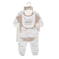 Description : 6 Piece mech bag  gift set including Bib, Bodyvest, Hat, Sleepsuit, Mittens and Jute Bag