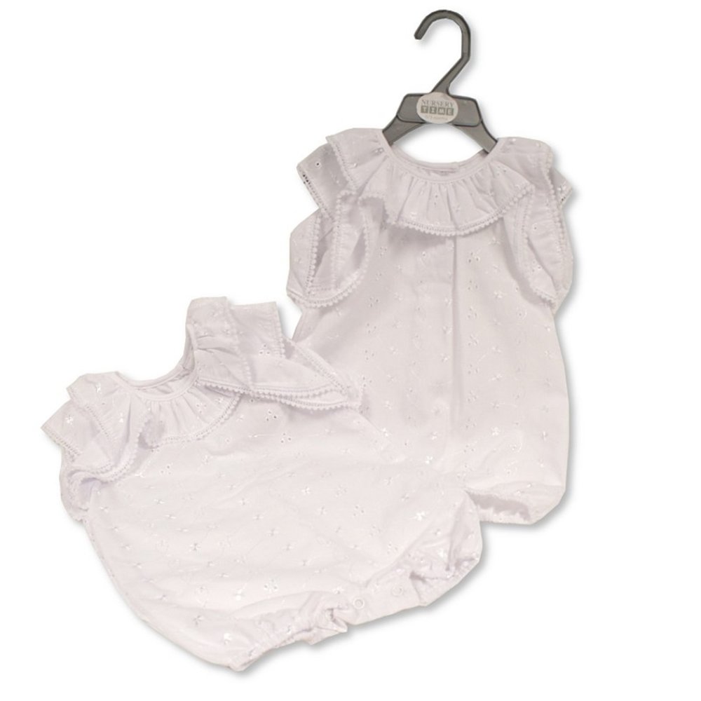 BIS-2120-6162W: Baby Girls Broderie Anglaise Romper- White (NB-6 Months)