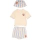 Material: TEE/TEE COLLA:L100% COTTON/ INTERLOCK COMBED180GM/M.                                                                                                                          TEE V-NECK TRIANGLE AND HEM: 1X1 RIB 90% COTTON/10% ELASTANE 220GM/M                                                                                                            TEE HEM  1X1 RIB 90% COTTON/10% ELASTANE 220GM/M                                                                                                                                                      SHORTS AND HAT SHELL: AOP 60% COTTON/40% POLYESTER LOOP BACK FRENCH TERRY 220GM/M;