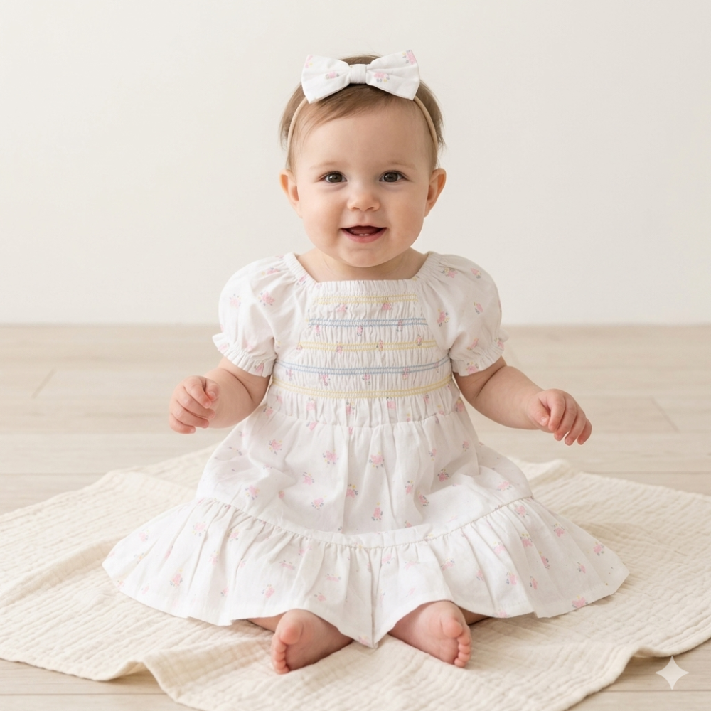 H14293INF: Baby Girls Smocked Dress & Headband Set (12-24 Months)