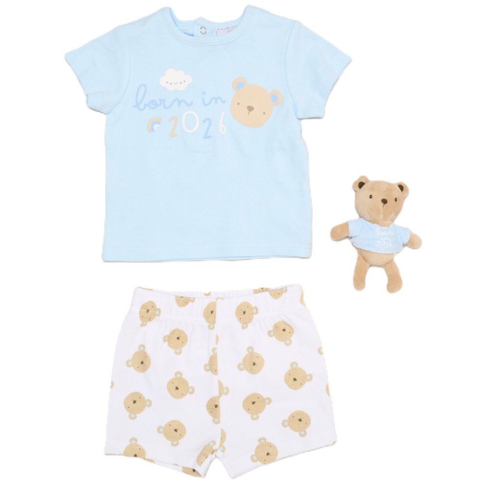 H14311NB: Baby Boys Bear T-Shirt, Shorts & Plush Toy Set - Born In 2026 (0-9 Months)