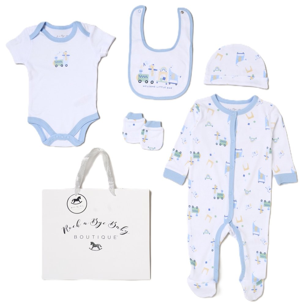 H14415NB: Baby Boys Animal Train 6 Piece Mesh Bag Gift Set (NB-6 Months)