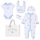Description : 6 Piece net bag  gift set including Bib, Bodyvest, Hat, Sleepsuit, Mittens and Gift Bag