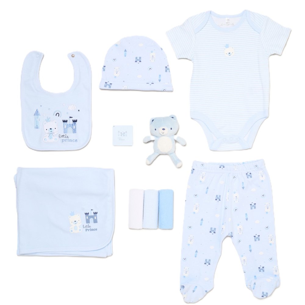 Description : 10 Piece net bag  gift set including Bib, Bodyvest, Hat, Trouser, 3 x wash cloths, Gift Card, Blanket & Soft Toy