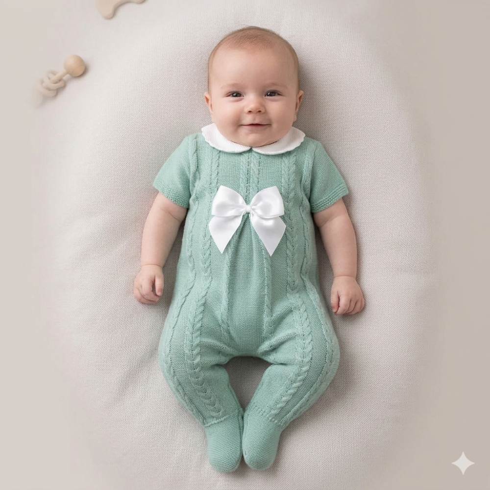 MC767-Sage: Baby Short Sleeve Knitted All In One With Bow (0-9 Months)