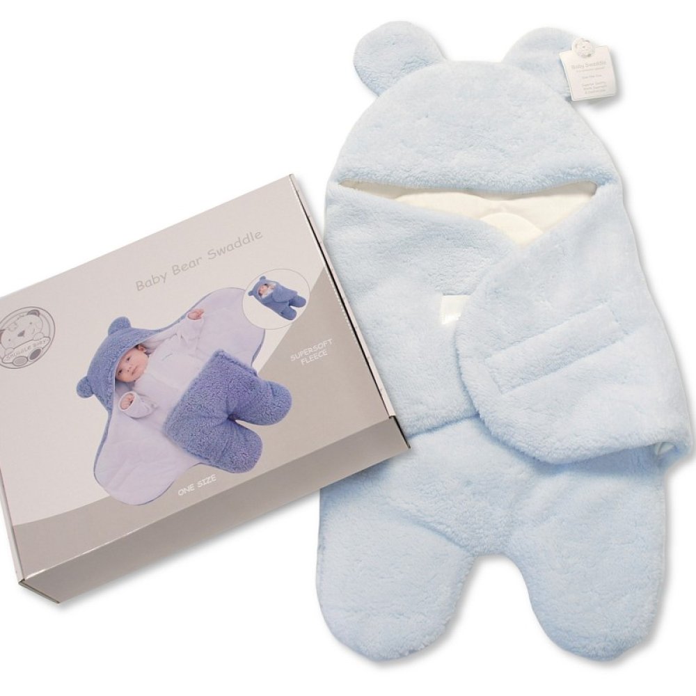 BW-112-2022S: Baby Bear Swaddle Wrap with Hood in Box- Sky