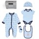 Description : 6 Piece net bag  gift set including Bib, Bodyvest, Hat, Sleepsuit, Mittens and Gift Box