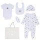 Description : 6 Piece net bag gift set including Bib, Bodyvest, Hat, Sleepsuit, Mittens and Gift Bag