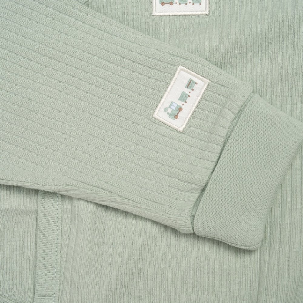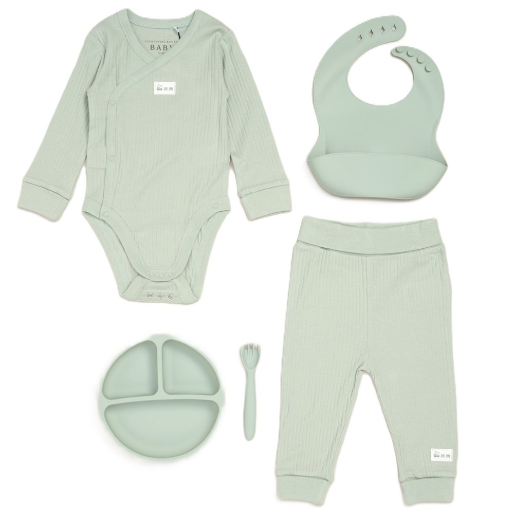 G11400NB: Baby Sage Ribbed Bodysuit & Pant With Silicone Food Catcher Bib, Bowl & Spork Set (9-24 Months)