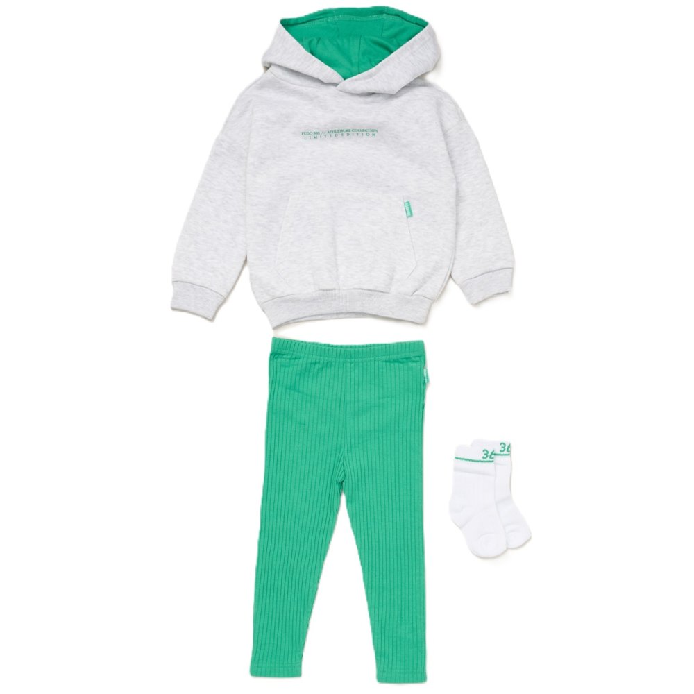 Material: 62% Cotton/ 38% Polyester hoody, 50% Cotton/ 48% Polyester/ 2% Elastane Legging, 58% Cotton/ 40% Polyester/ 2% Elastane SocksSizes (months): 12, 18, 24Colour: As Image -