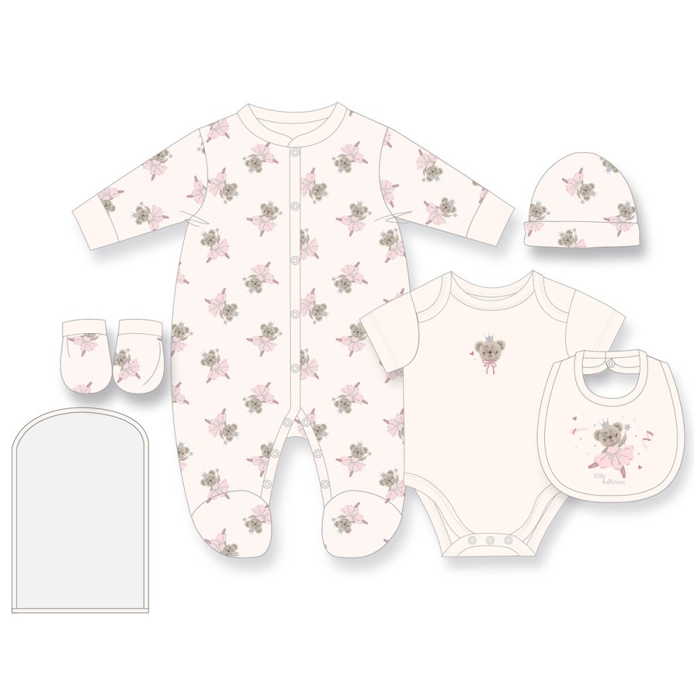 G12564NB: Baby Girls Bear Ballerina 6 Piece Mesh Bag Gift Set (NB-6 Months)