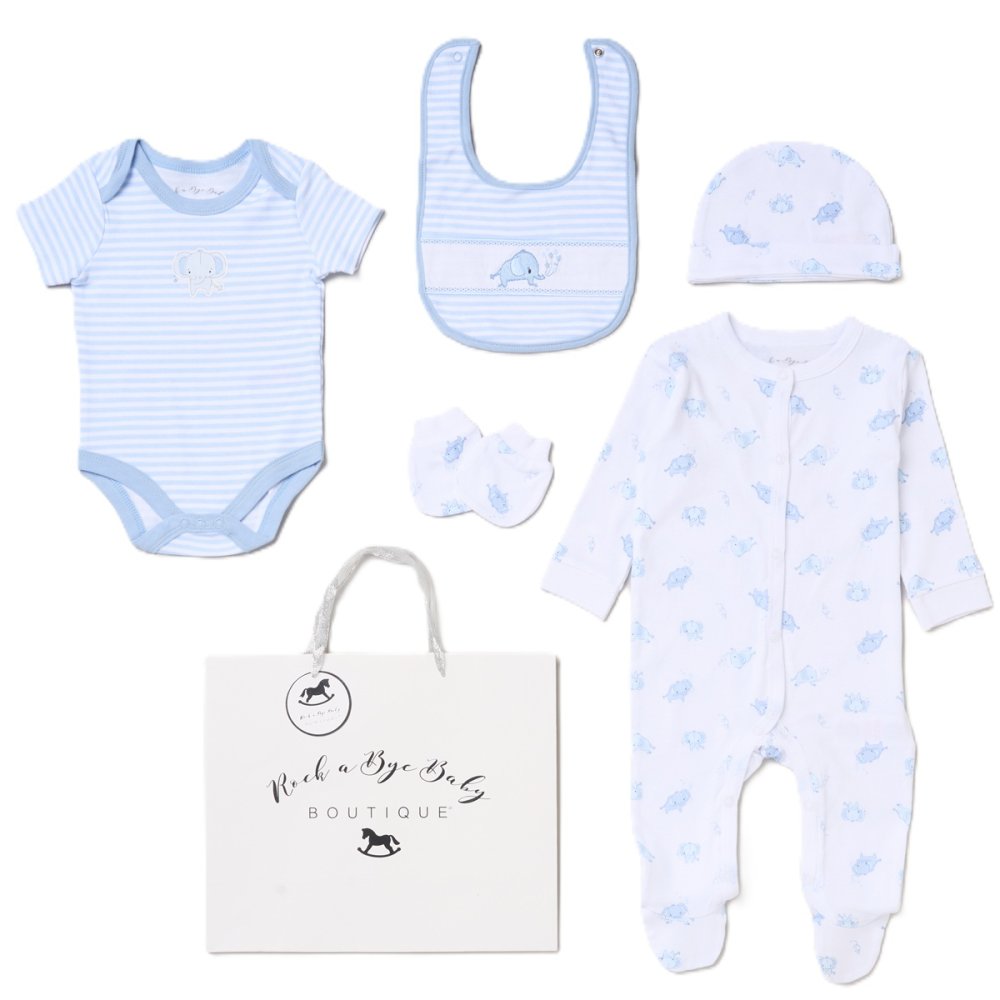 H12670NB: Baby Boys Elephant 6 Piece Mesh Bag Gift Set (NB-6 Months)