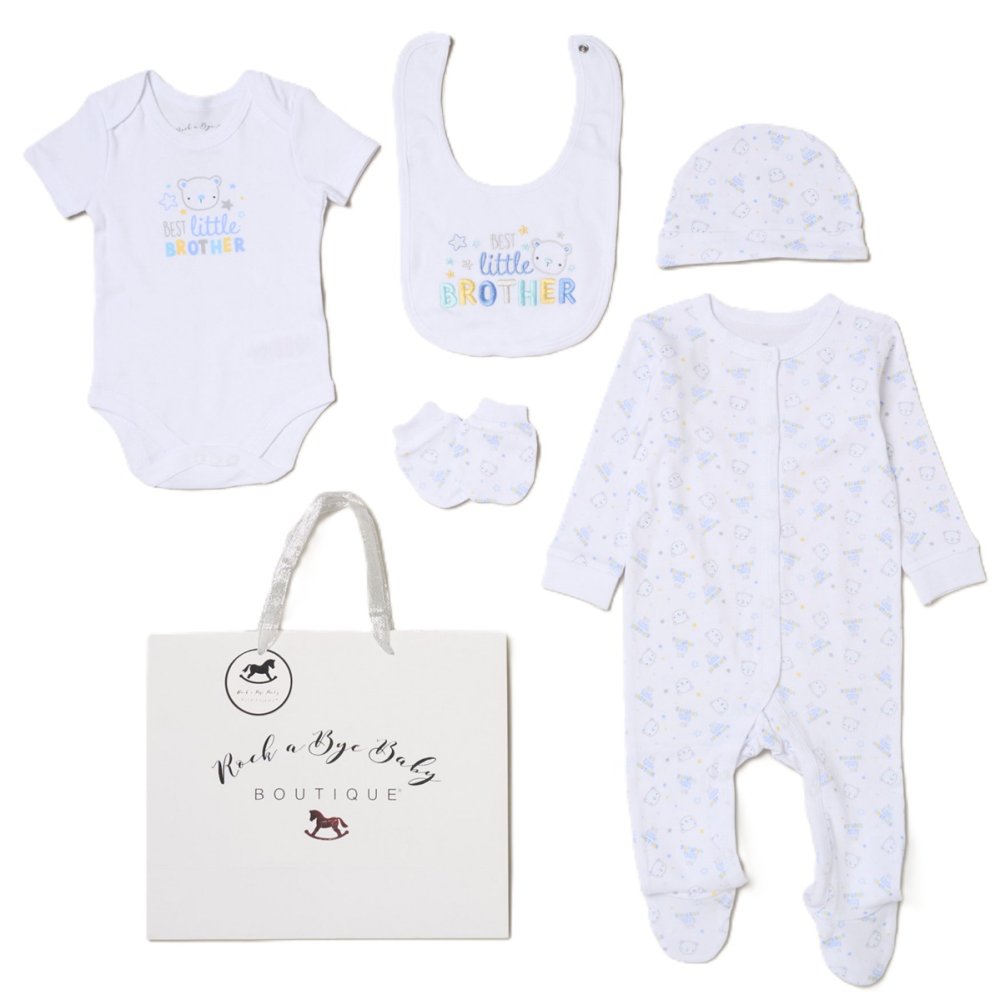 H13294NB: Baby Boys 6 Piece Mesh Bag Gift Set- Best Little Brother (NB-6 Months)