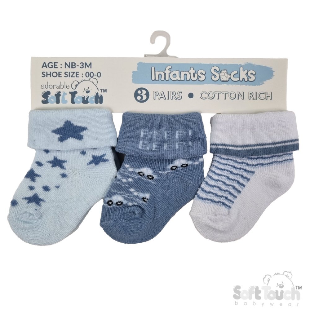 S506-B: Blue 3 Pack Turnover Socks (0-12 Months)
