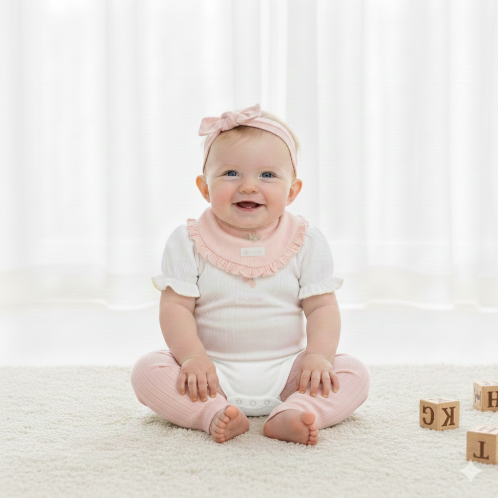 Ribbed Bodysuit, Ruffle Bum Ribbed Legging, Bib,HeadbandMaterial: 100% CottonSizes (months): 0-3, 3-6, 6-9Colour: As Image -