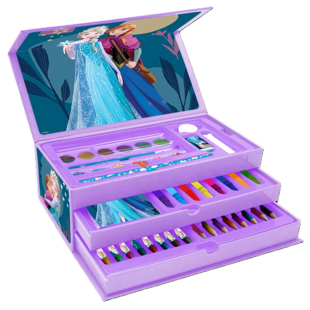 This case contains everything children need for a fun day of arts and crafts. Made from strong, durable material making it ideal for school. Contains 12 paint cakes, 1 brush, 1 palette, 1 HB pencil, 2 erasers, 1 colouring book with 10 sheets, 1 sponge, 8 water based coloured fibre pens, 8 colouring pencils, 8 crayons